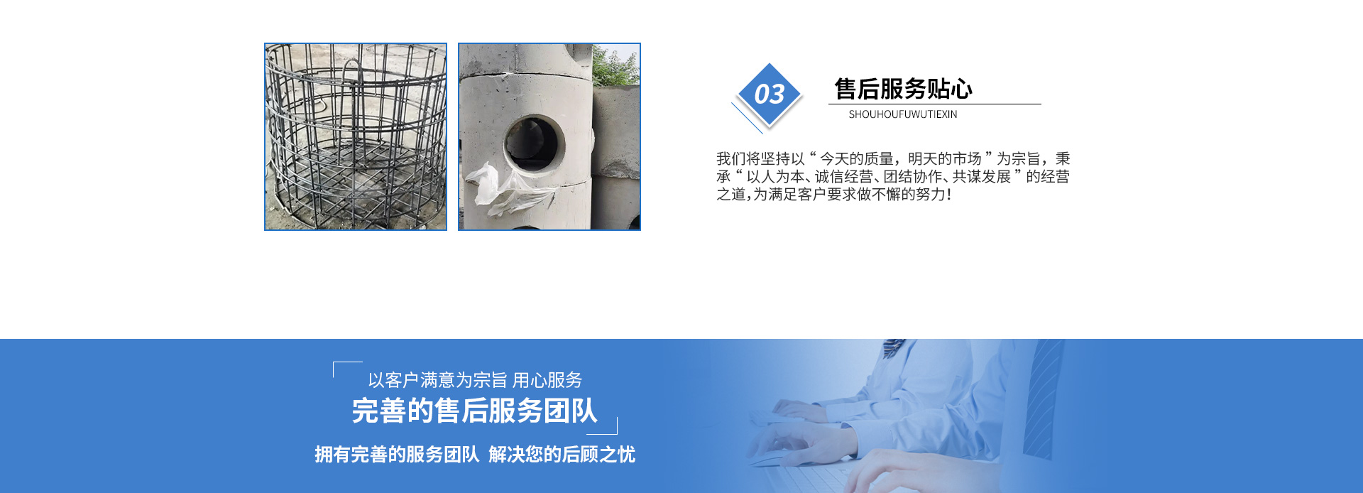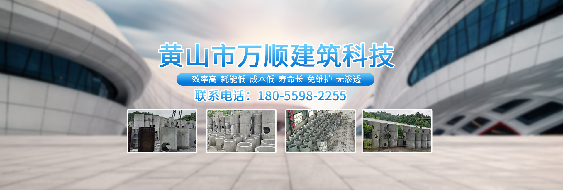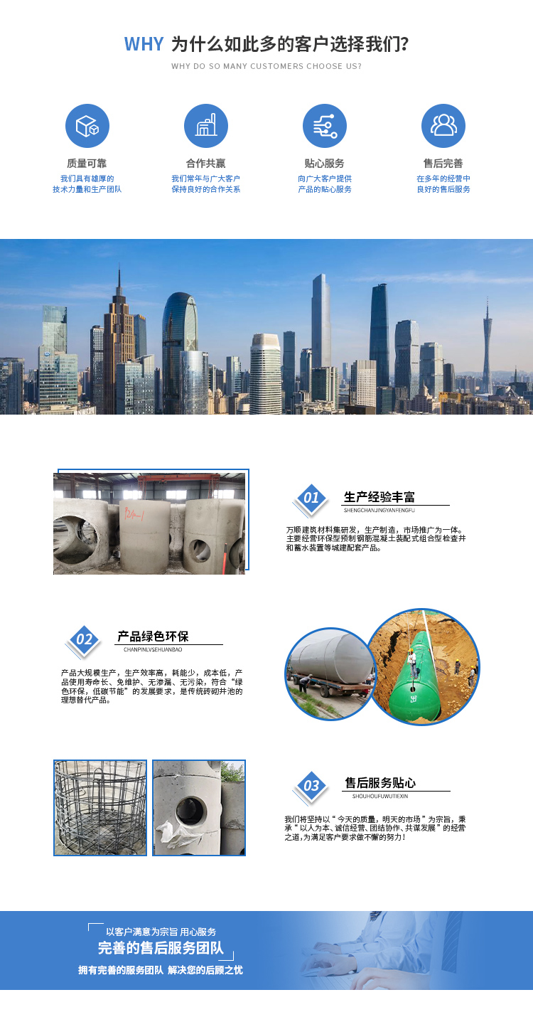 黃山市萬順建筑科技有限公司是集研發(fā),生產(chǎn)制造,市場推廣為一體的綜合性企業(yè)。公司主要經(jīng)營環(huán)保型預制鋼筋混凝土裝配式組合型檢查井和蓄水裝置等城建配套產(chǎn)品。產(chǎn)品生產(chǎn)過程采用獨特的生產(chǎn)工藝,機械化流水作業(yè)。產(chǎn)品大規(guī)模生產(chǎn),生產(chǎn)效率高,耗能少,成本低,產(chǎn)品使用壽命長、免維護、無滲漏、無污染,符合“綠色環(huán)保,低碳節(jié)能”的發(fā)展要求,是傳統(tǒng)磚砌井池的理想替代產(chǎn)品。
